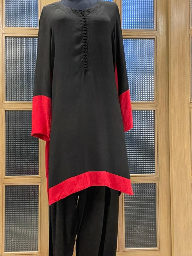 The Beautiful 2-Piece Pret features a unique Gol Gheera shirt design, accentuated by a striking red gol border. Its plain sleeve borders keep the look subtle yet refined, while the elegant gala with luppi buttons adds a graceful touch.