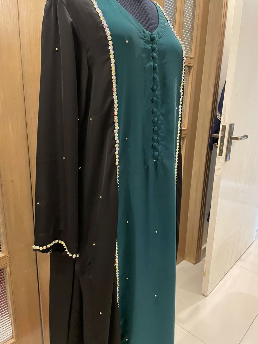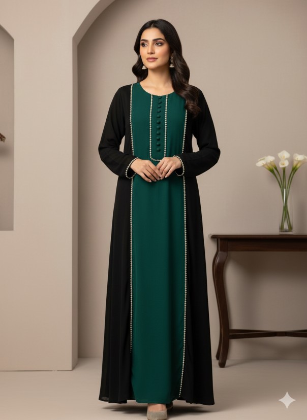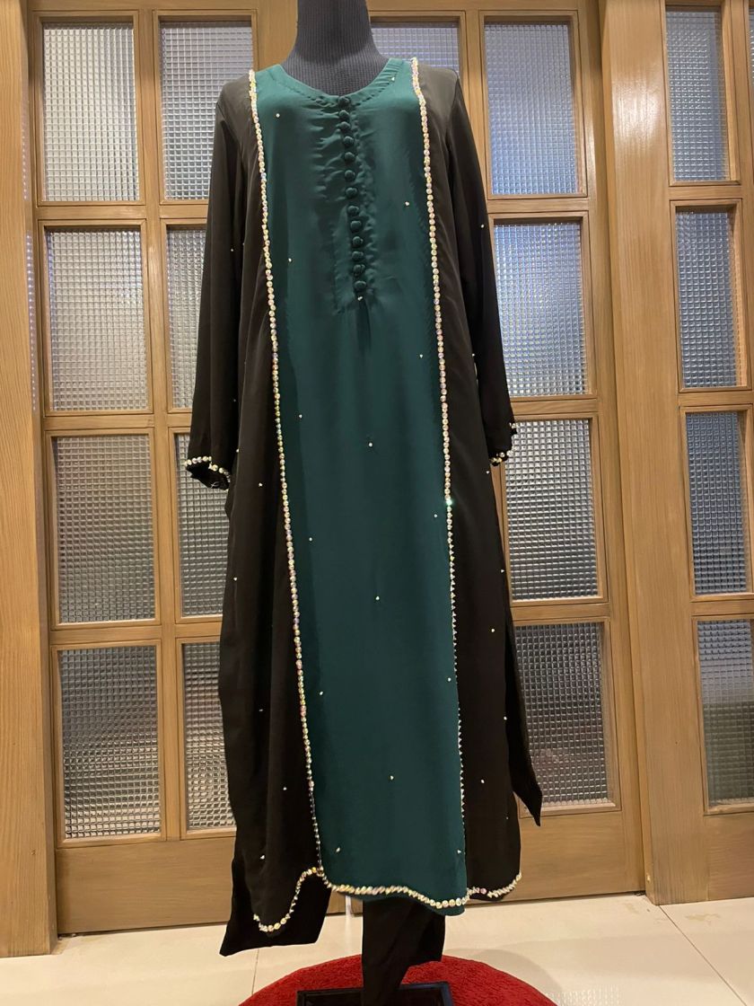 The Elegant Nida Grip Stitched Suit with Silk Dupatta is a timeless creation crafted from premium fabrics. The shirt, made with high-quality Nida grip fabric, is styled in a striking black and dark green palette. Delicate ada handwork and crystal embellishments add a subtle sparkle, making it an outfit that balances tradition with modern refinement.
